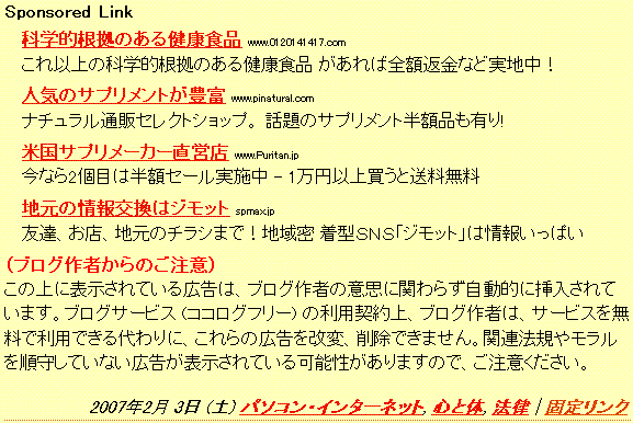 以前の記事「薬事法・健康増進法逃れに利用される Google AdSense」にも書いたように、このブログサービス (ココログフリー) の記事の末尾には、Google AdSense と呼ばれる仕組みによって、自動的に広告が挿入されている。