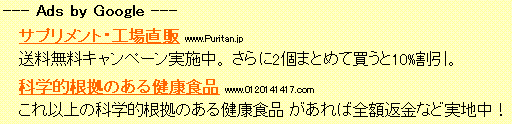 ところで、ココログフリーの Google AdSense について、ちょっと前までは「--- Ads by Google ---」と表示されていた。(リンクの色の違いはデザイン変更によるもので意味はない)